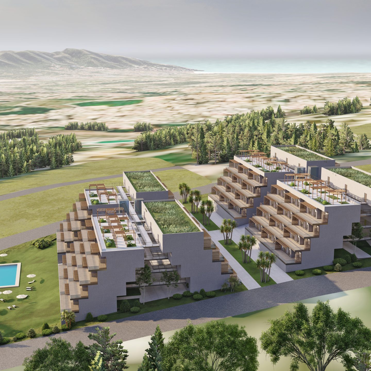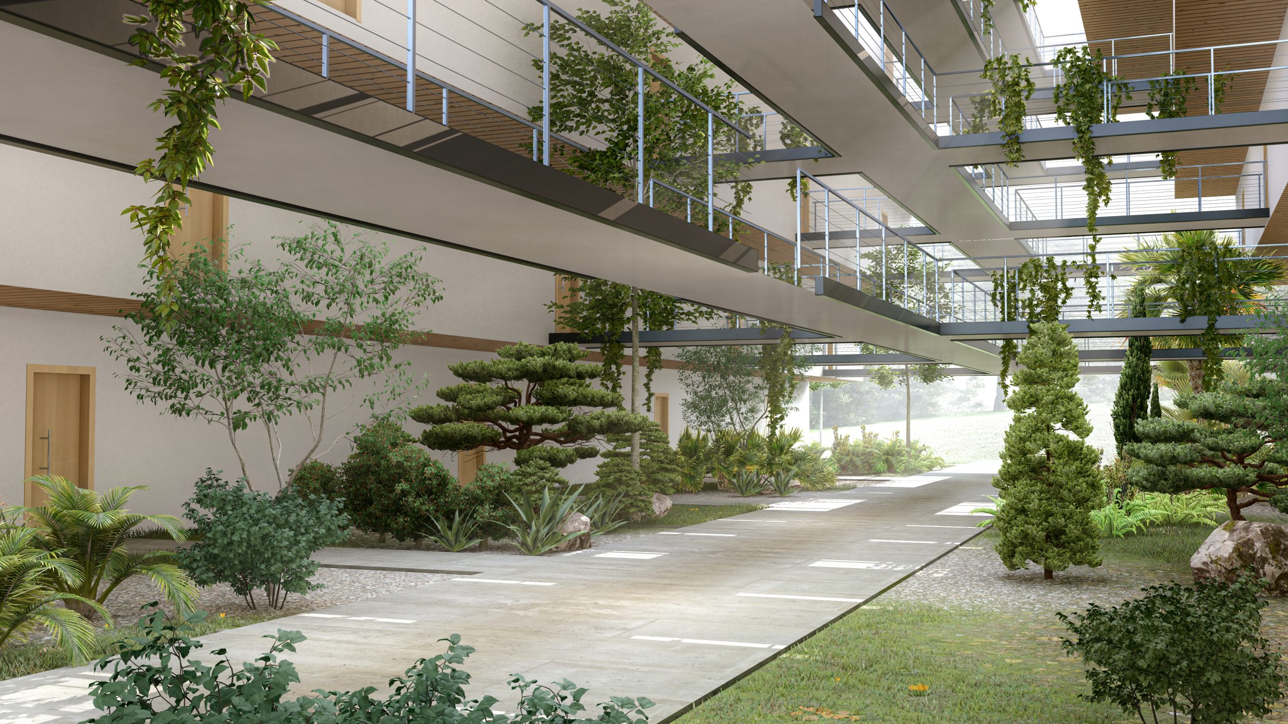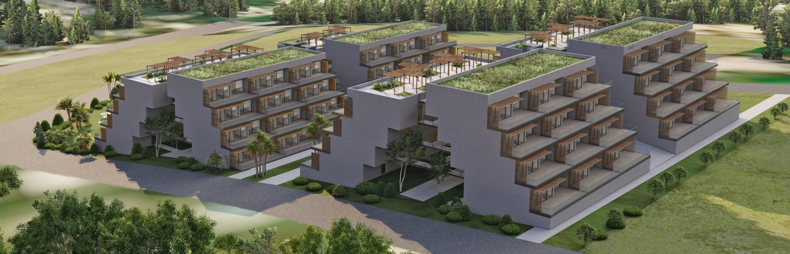 The building is organized into two open blocks of four floors, with a pyramidal structure, aiming to maximize the enjoyment of contact with nature. In each block, the spacious outdoor terraces are complemented by a landscaped interior pathway leading to the homes. A transversal communication axis on the ground floor connects both blocks, merging various landscaped areas where common spaces are articulated.