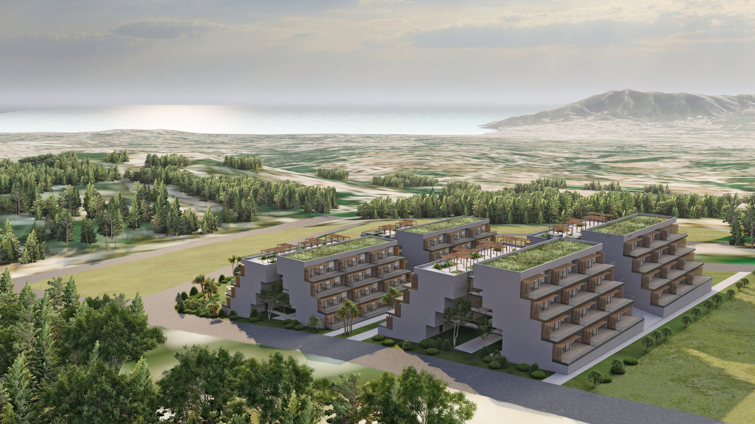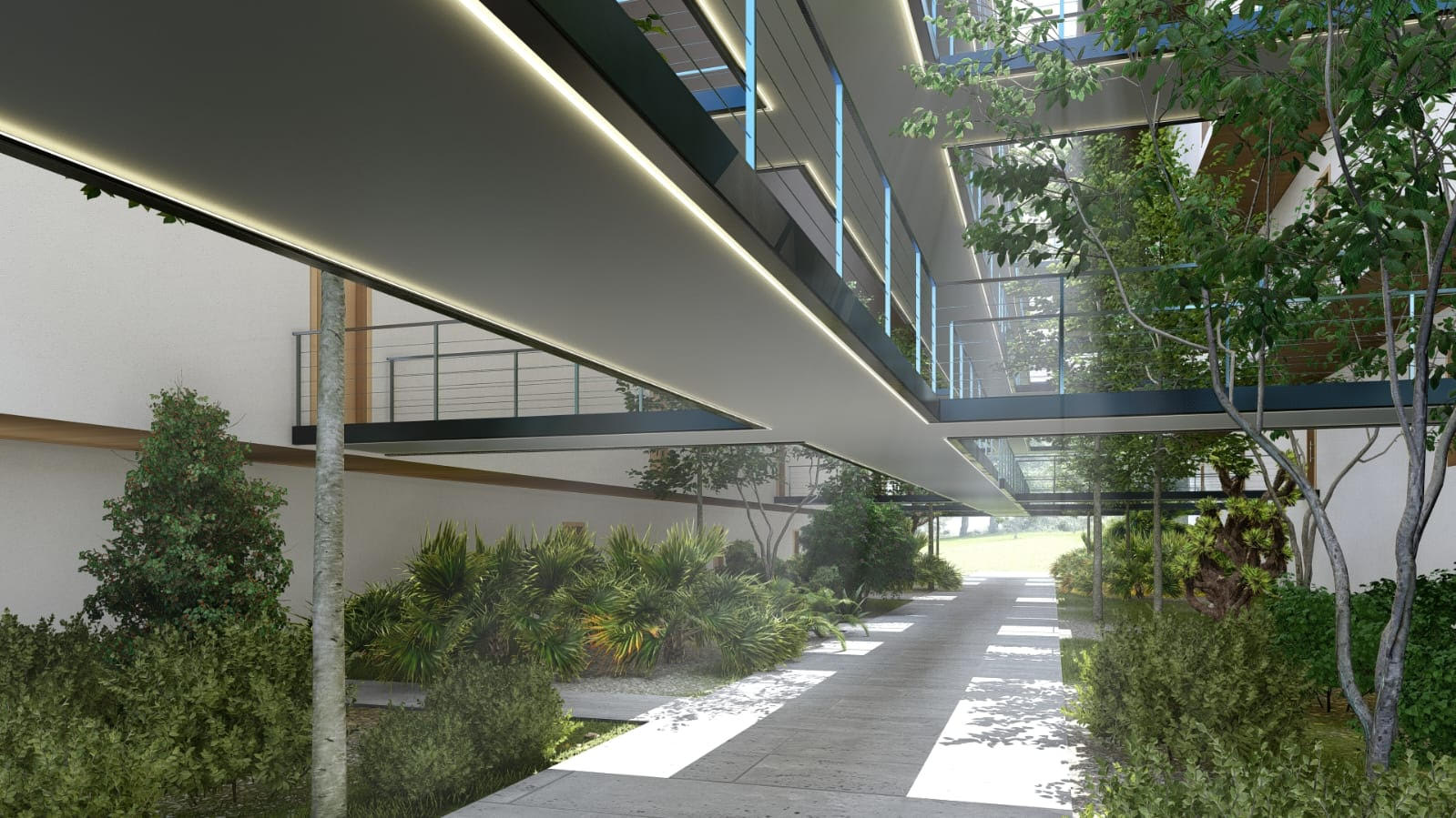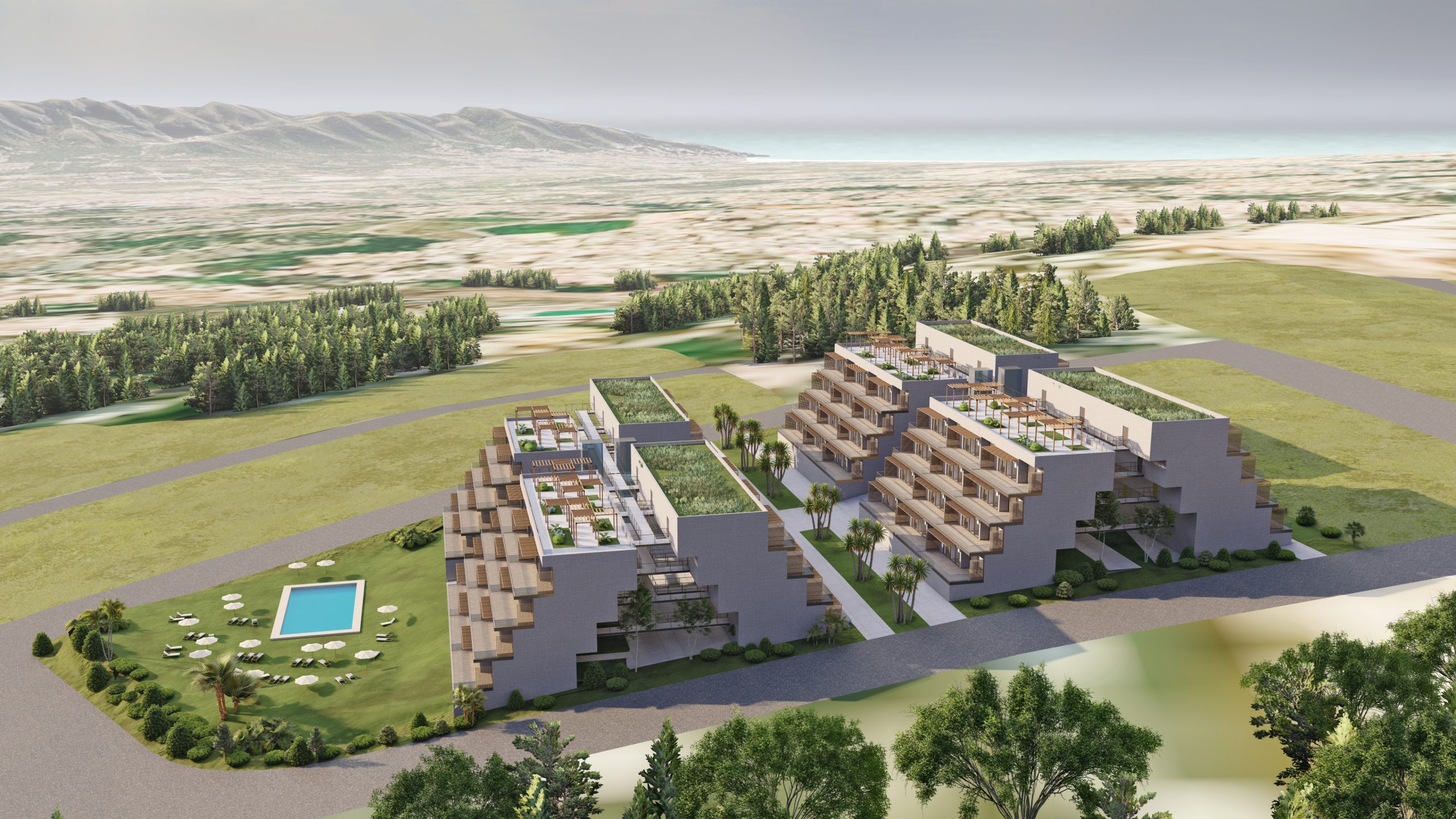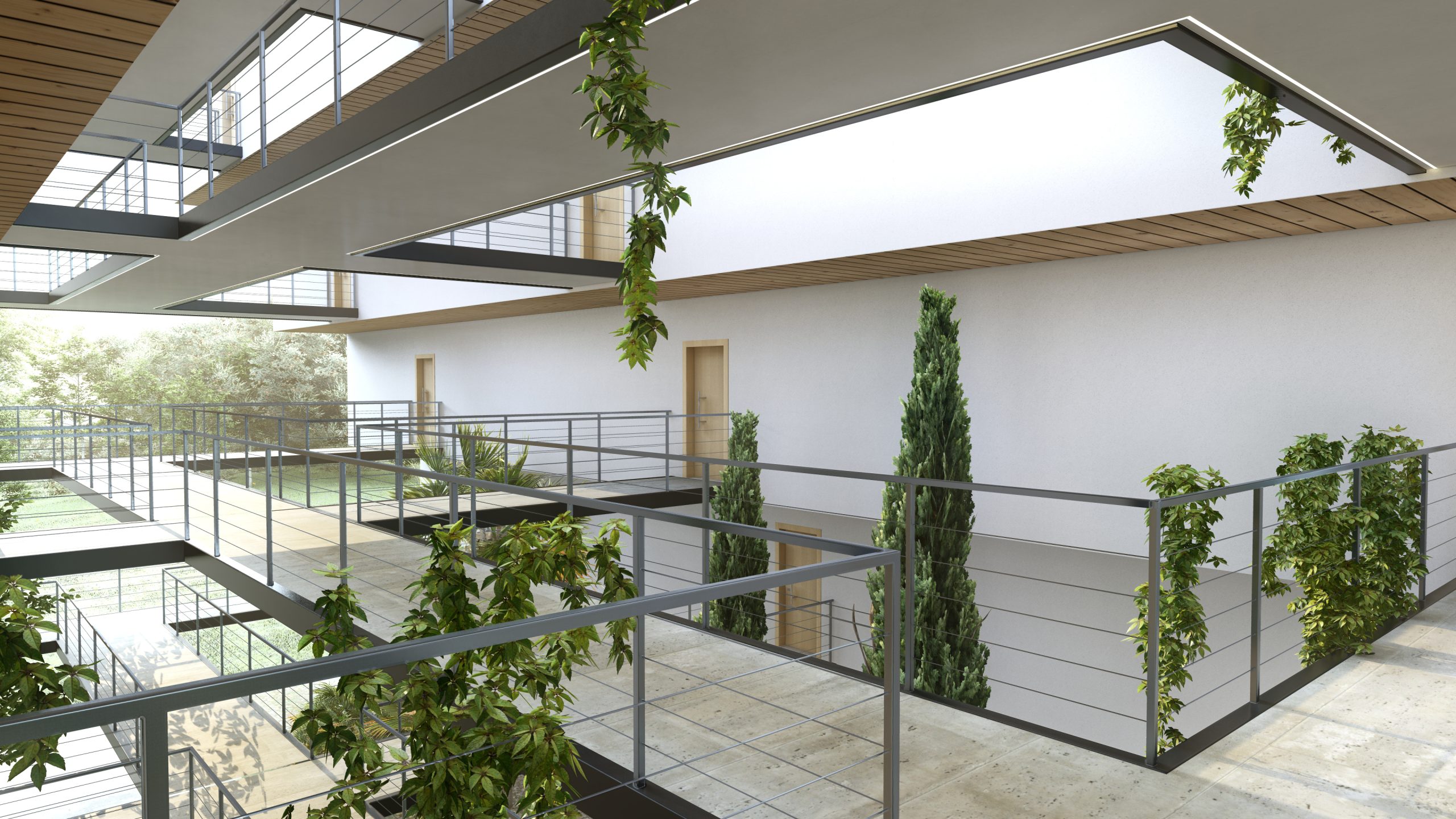 The building is organized into two open blocks of four floors, with a pyramidal structure, aiming to maximize the enjoyment of contact with nature. In each block, the spacious outdoor terraces are complemented by a landscaped interior pathway leading to the homes. A transversal communication axis on the ground floor connects both blocks, merging various landscaped areas where common spaces are articulated.