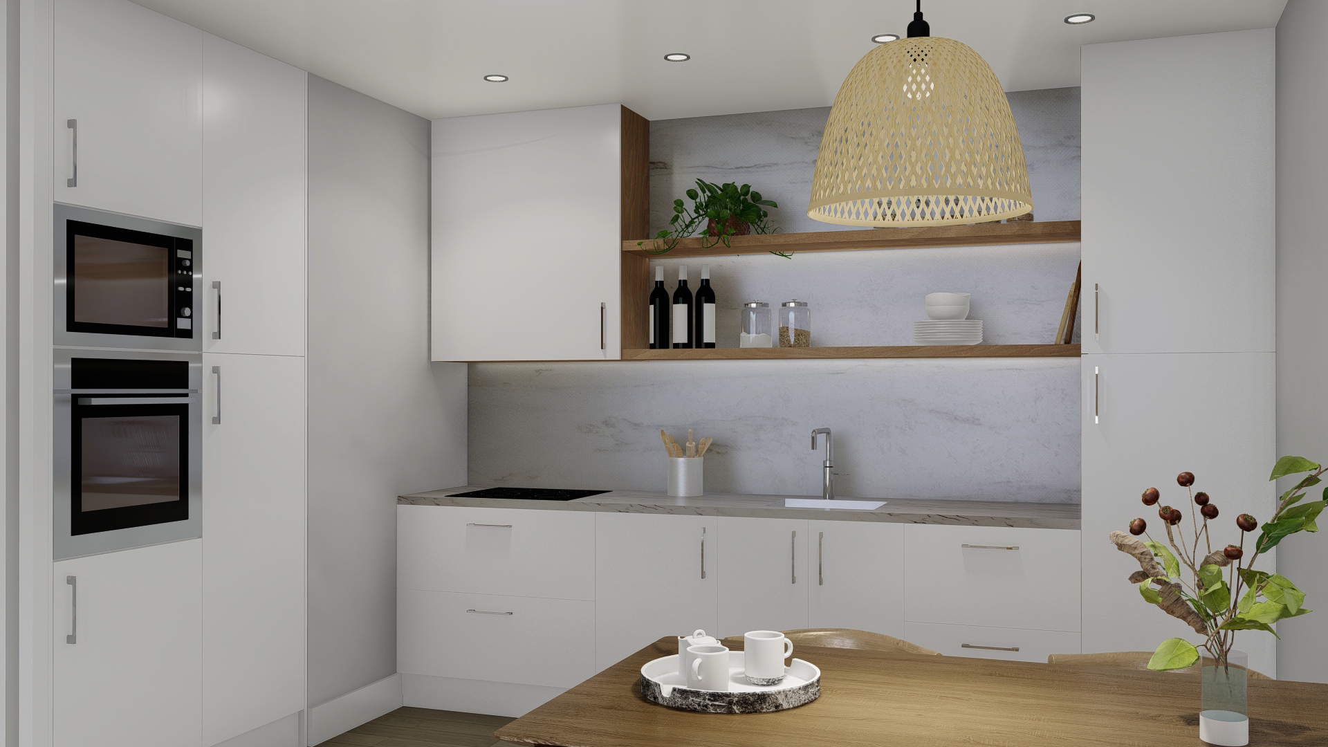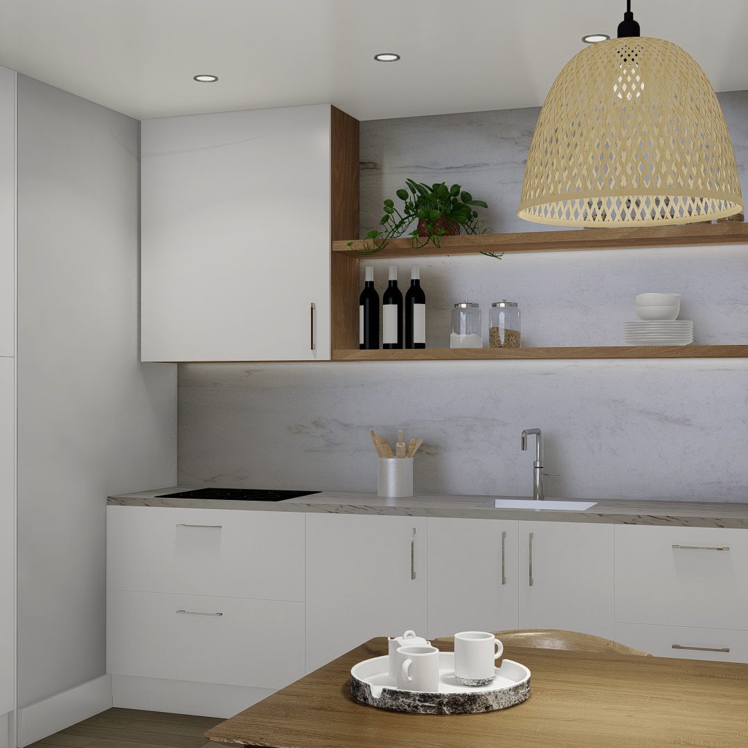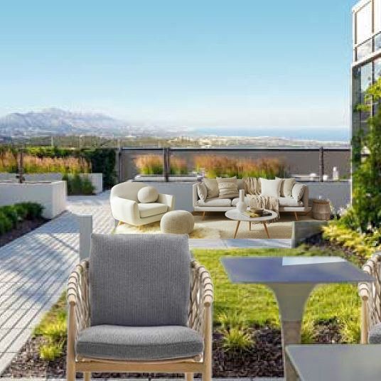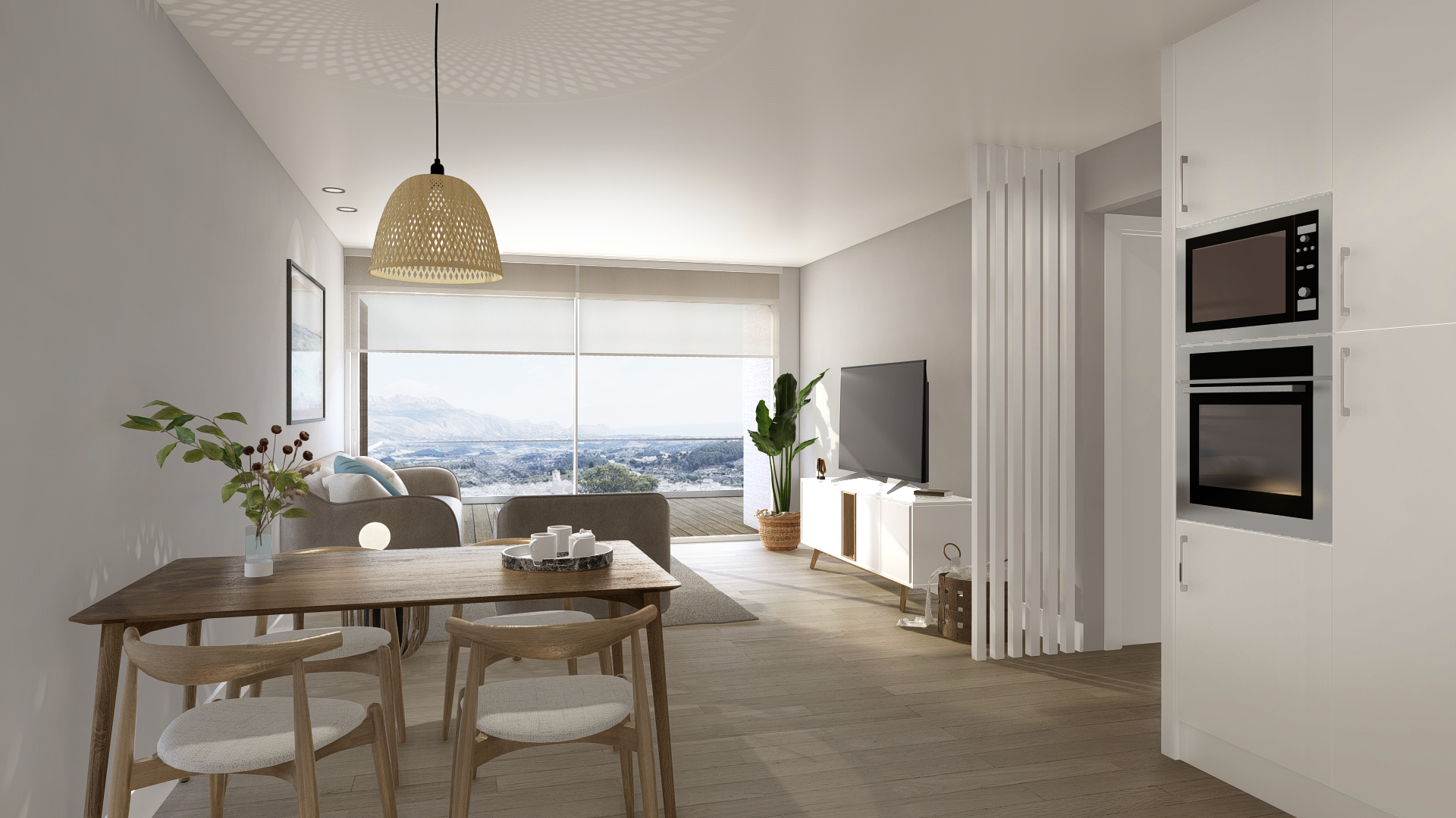 Las viviendas disponen de amplias terrazas y las habitaciones son todas exteriores. En el sótano se sitúan los garajes y cuartos de instalaciones comunes. El bloque tiene un aspecto moderno y limpio, con predominio del vidrio sobre paredes blancas. Los vuelos de las terrazas son estilizados y le aportan ligereza.