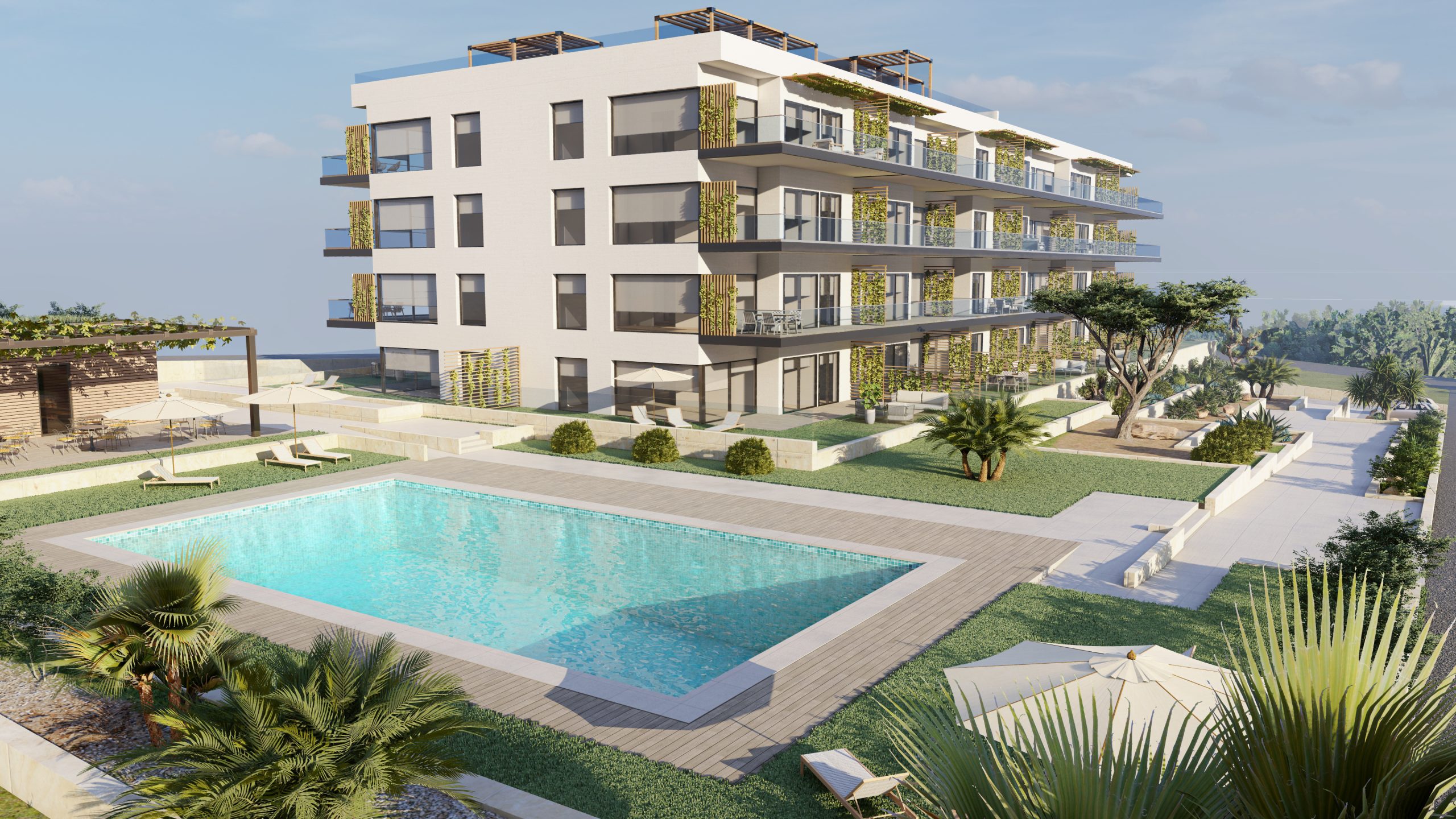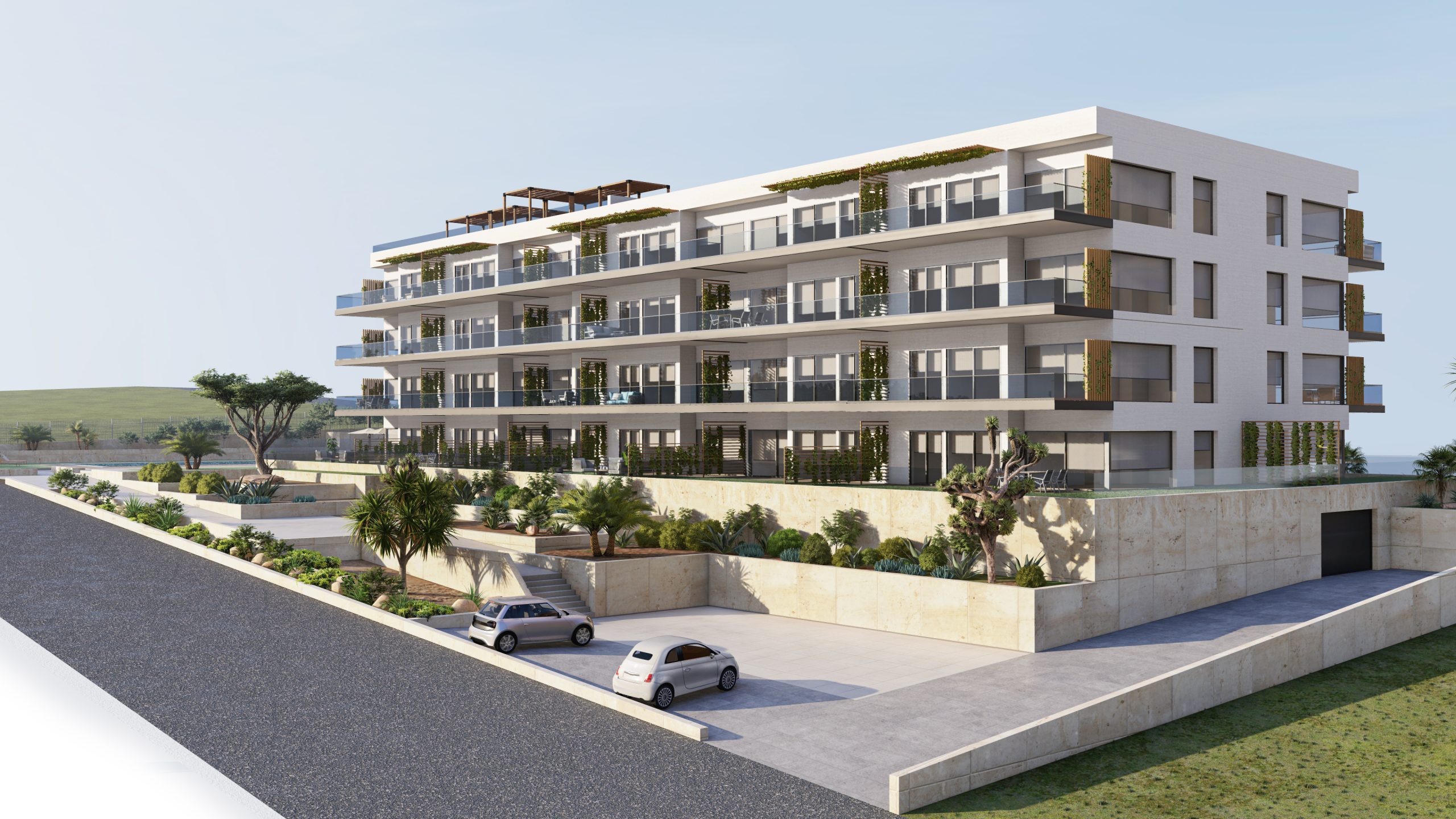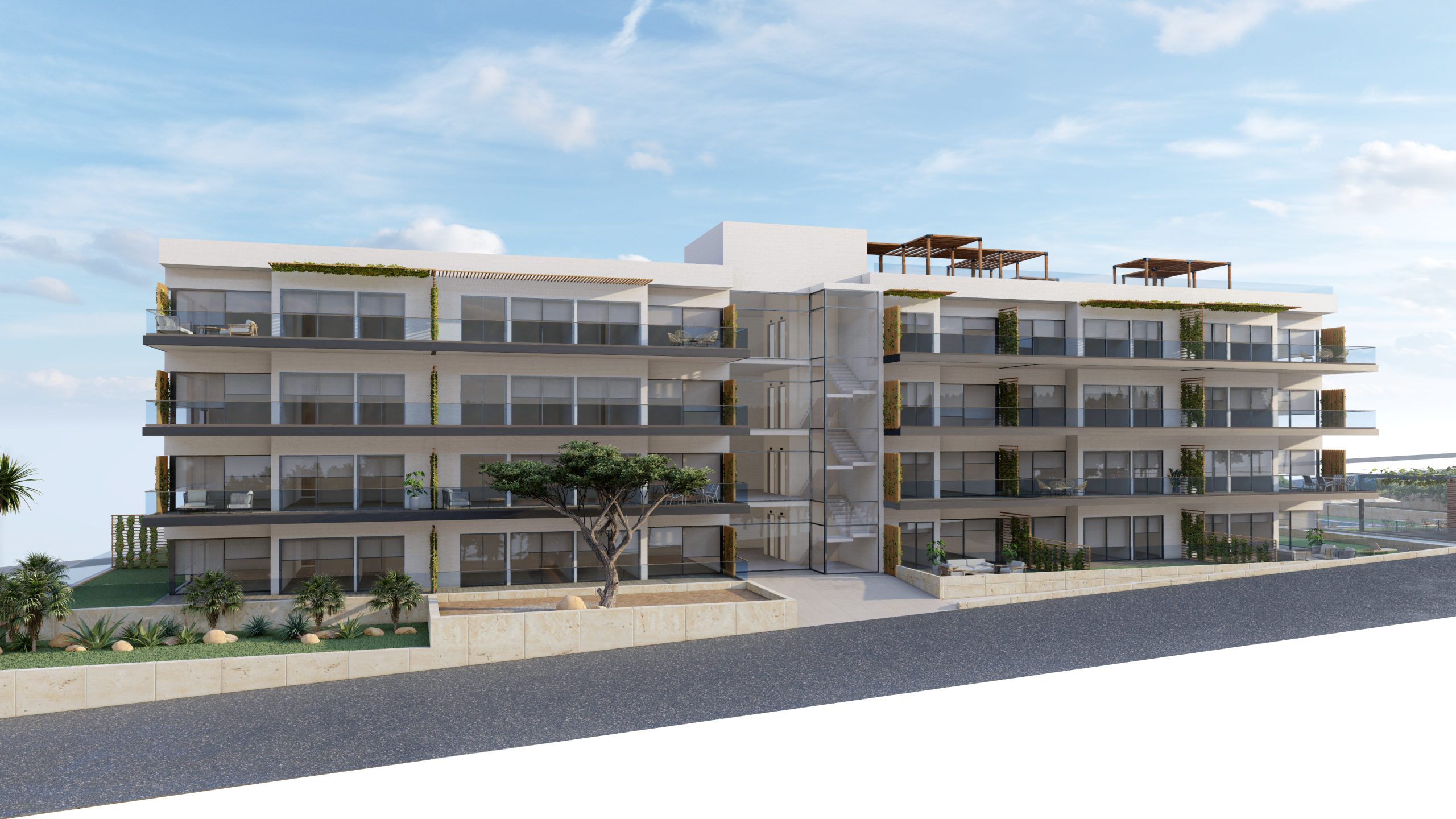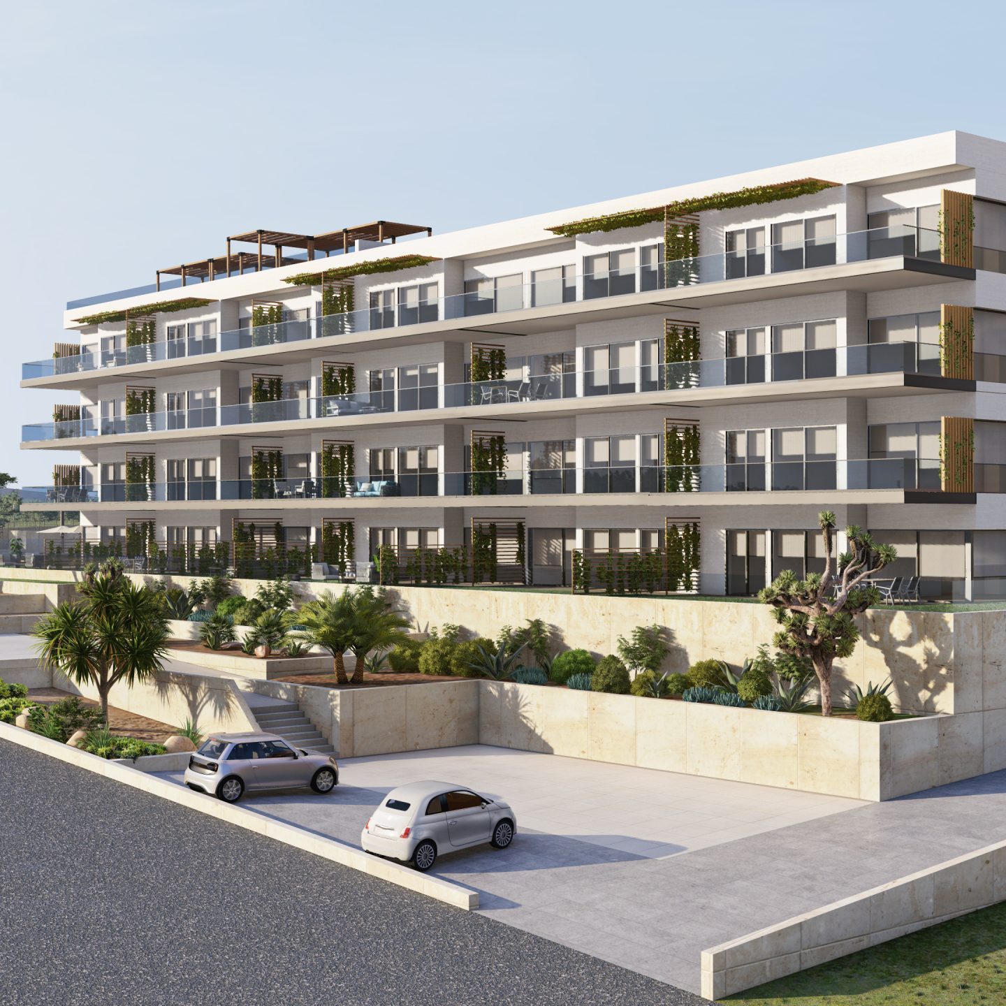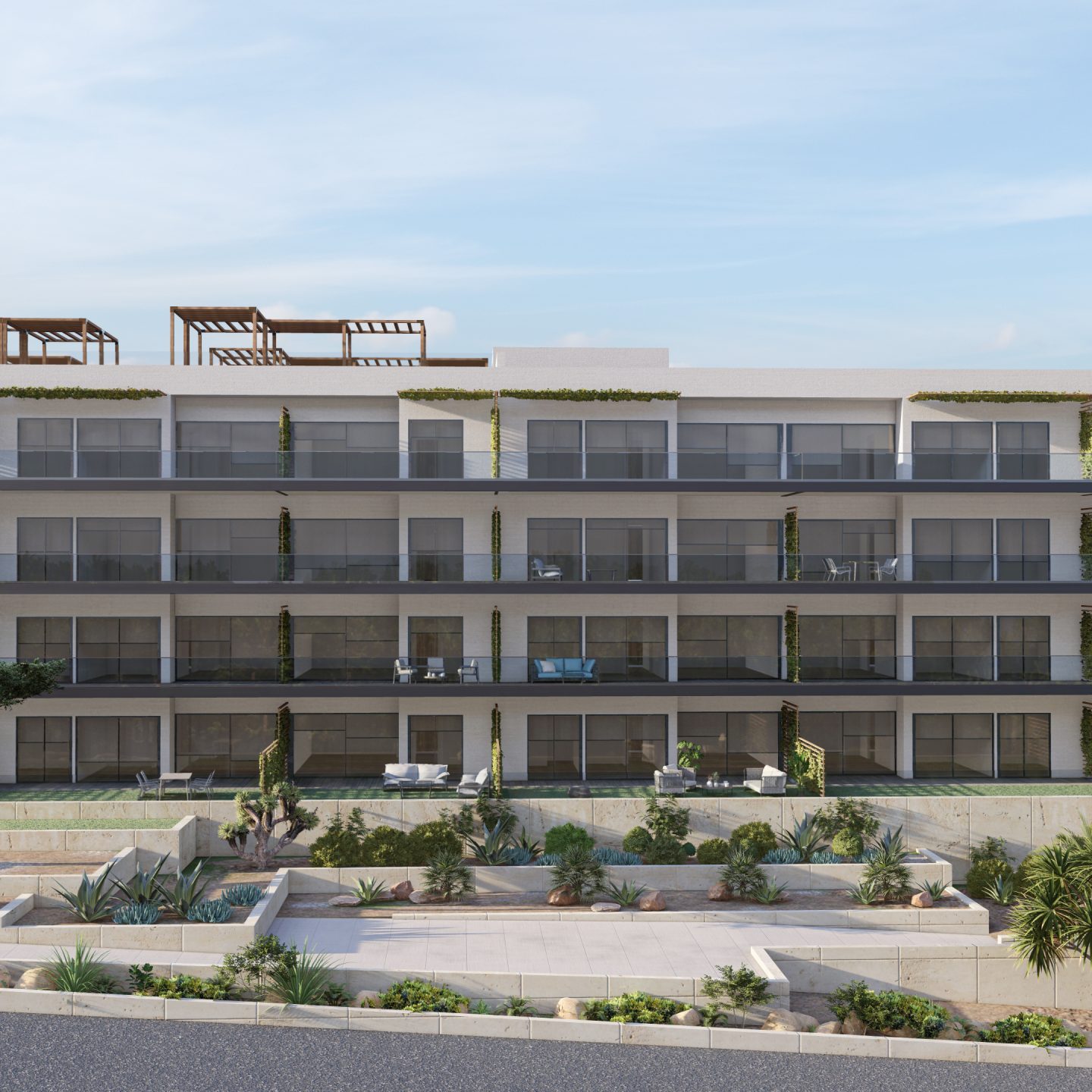 Bloque abierto de 44 viviendas de uno, dos y tres dormitorios, con amplias terrazas voladas que protegen del sol. Se buscan la sombra, el contacto visual con el exterior y la funcionalidad. La parcela se urbaniza y ajardina para el disfrute de la comunidad, con una gran piscina y zonas comunes. La cubierta se ajardina en parte, y se generan en ella espacios adaptados al ocio y al deporte.